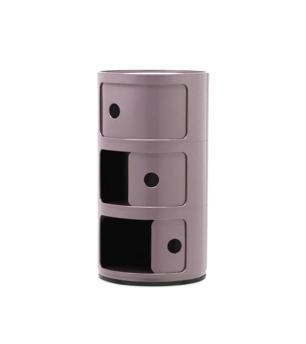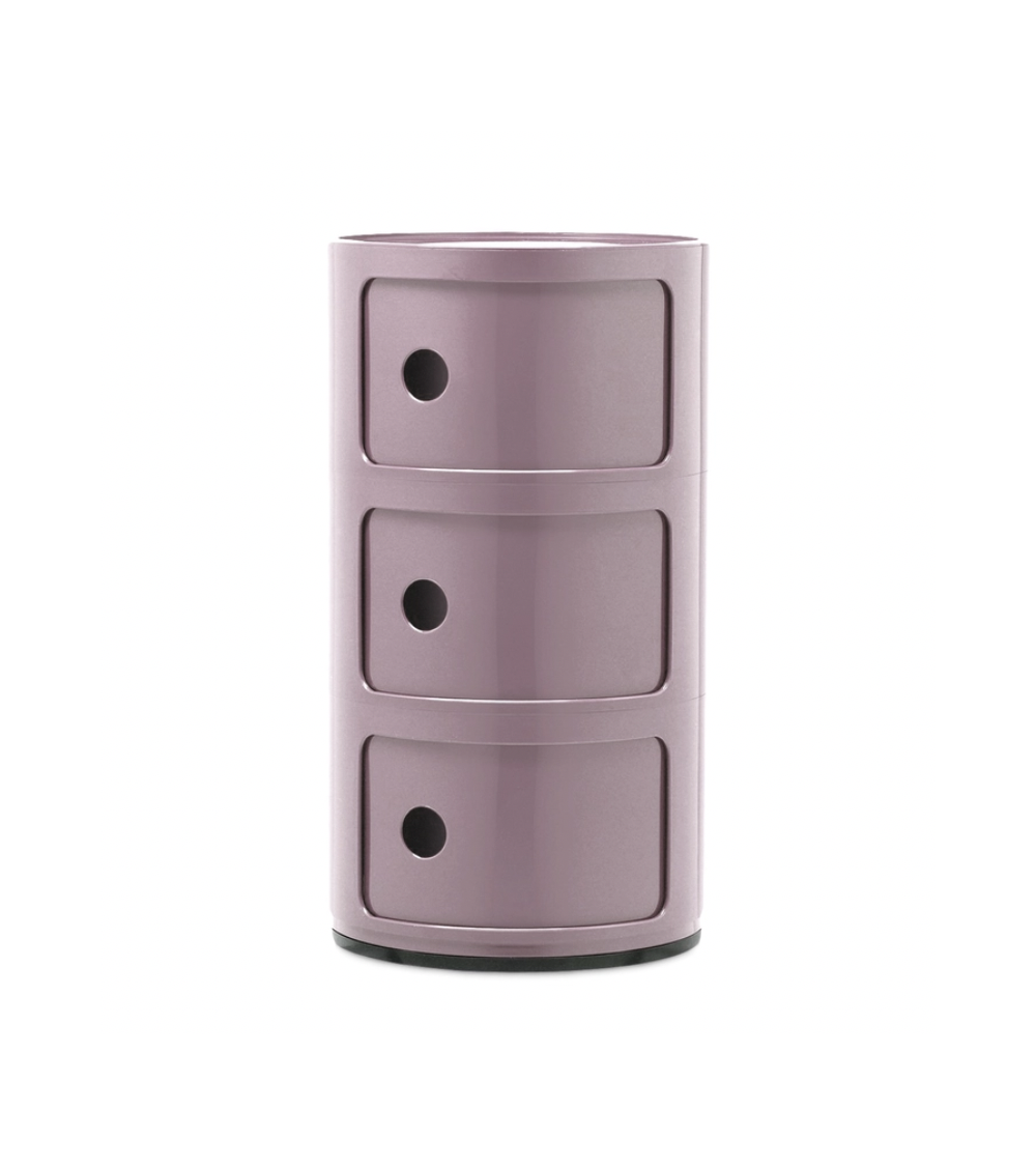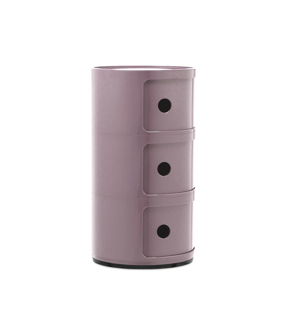 Progettati da Anna Castelli Ferrieri nel 1967, i Componibili sono contenitori modulari realizzati in ABS, nati per rispondere con eleganza alle esigenze della vita quotidiana. Disponibili in versione cilindrica o quadrata, con uno o più moduli impilabili, si distinguono per il caratteristico sportello scorrevole con foro circolare. Versatili, leggeri e resistenti, si adattano a ogni ambiente — dalla zona notte al bagno, fino agli spazi outdoor. Oggi proposti anche in materiali riciclati e bioplastica, restano un’icona essenziale del design italiano.