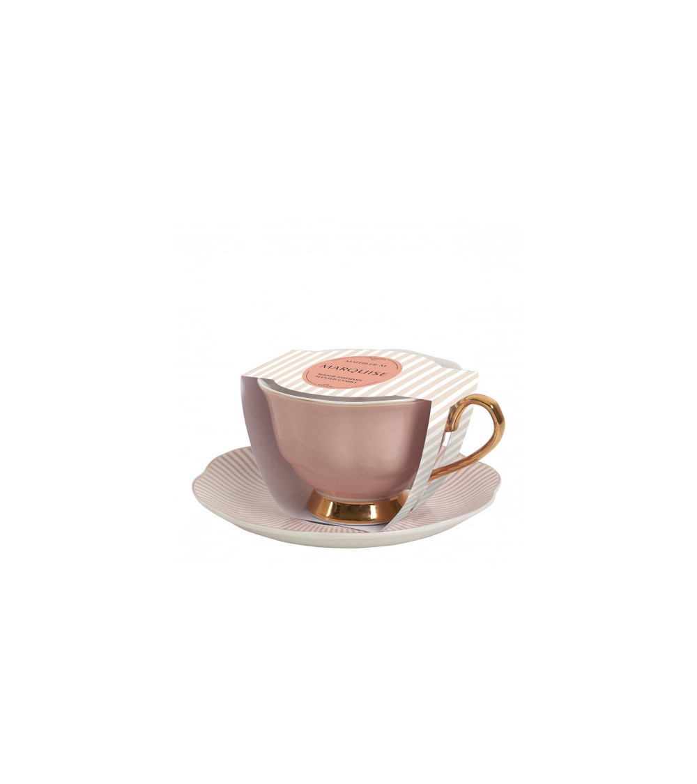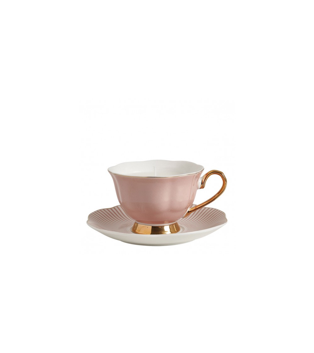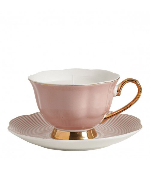 Candela profumata in tazza con piattino color rosa, appartenente alla collezione Madame de Rècamier del marchio Mathilde M.