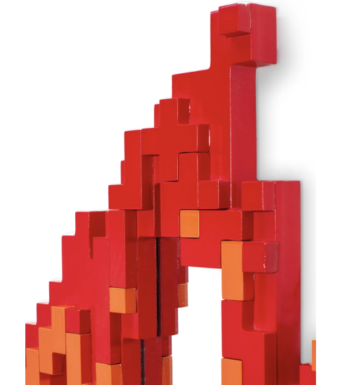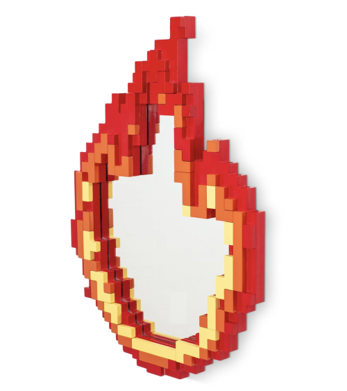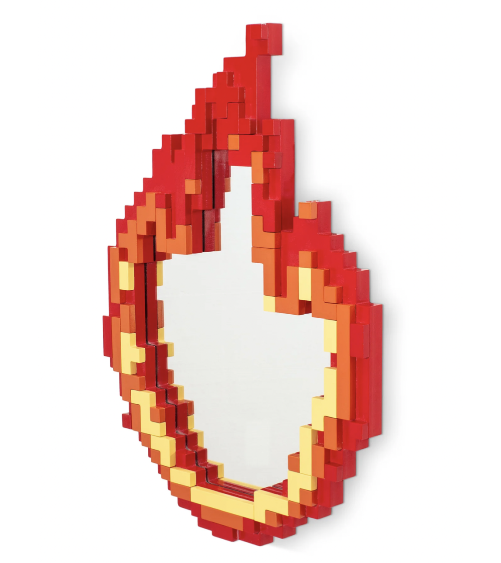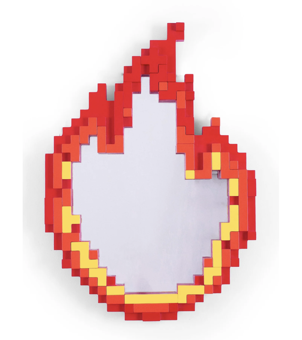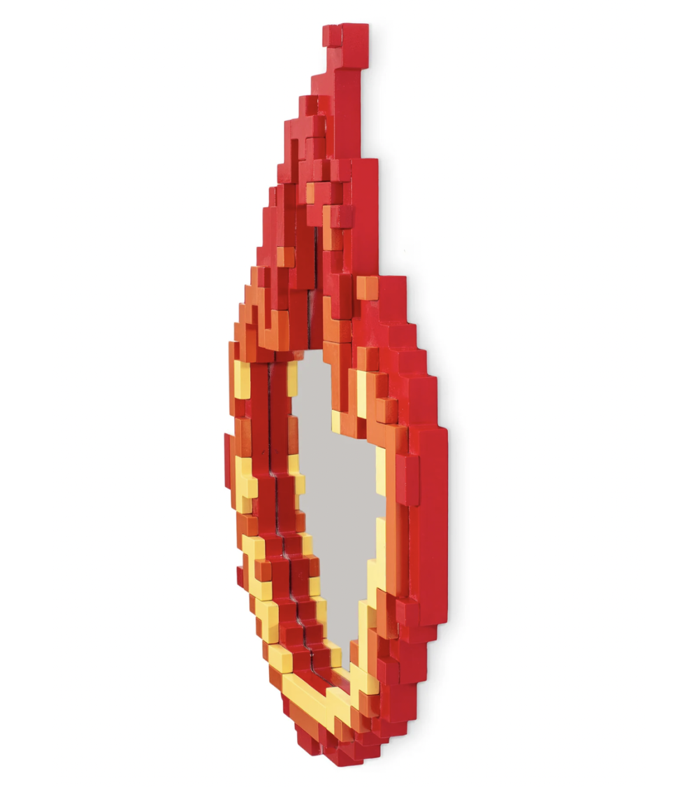 La sua cornice in MDF laccato, scolpita come una fiamma in pixel art, si accende in tonalità vivaci di rosso e arancio, evocando la grafica dei videogame anni Ottanta con un’ironia colta e giocosa. Al centro, la superficie specchiante in vetro riflette la realtà con un tocco di distorsione concettuale: chi si guarda diventa parte di un universo digitale, come un personaggio sospeso tra materia e schermo.