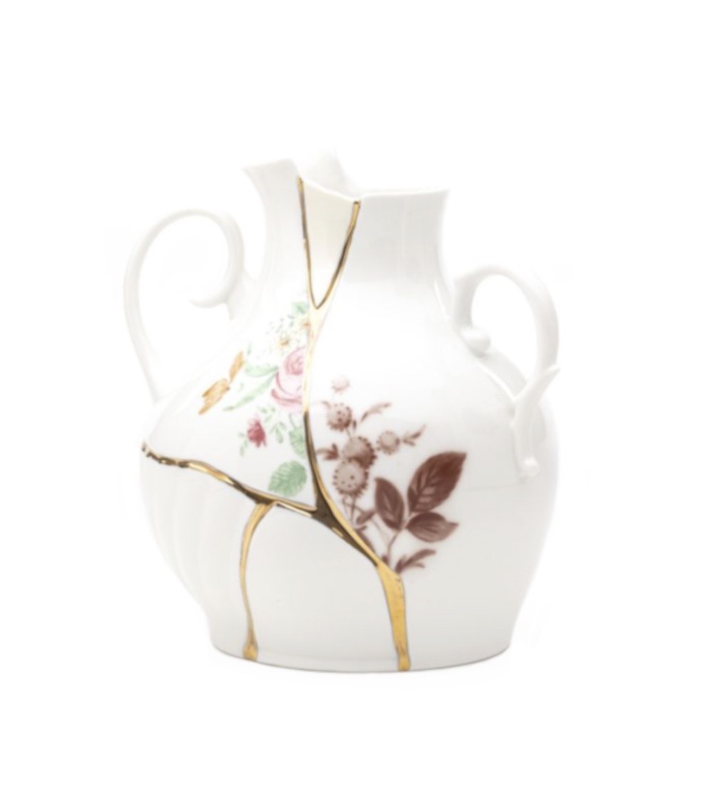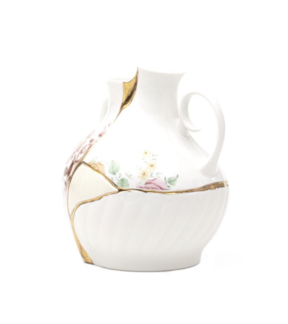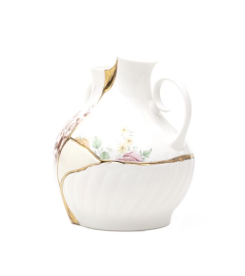 Questo vaso appartiene alla collezione "Kintsugi" progettata in collaborazione con l'artista "Marcantonio Malerba", un connubio tra arte e design contemporaneo. L'arte Kintsugi, una tecnica che consiste nel riparare ceramiche rotte utilizzando lacca mescolata con polvere d’oro, d’argento o platino. Questa pratica non solo ripara l’oggetto, ma valorizza le sue crepe, trasformandole in linee decorative che raccontano una storia di imperfezione e resilienza.