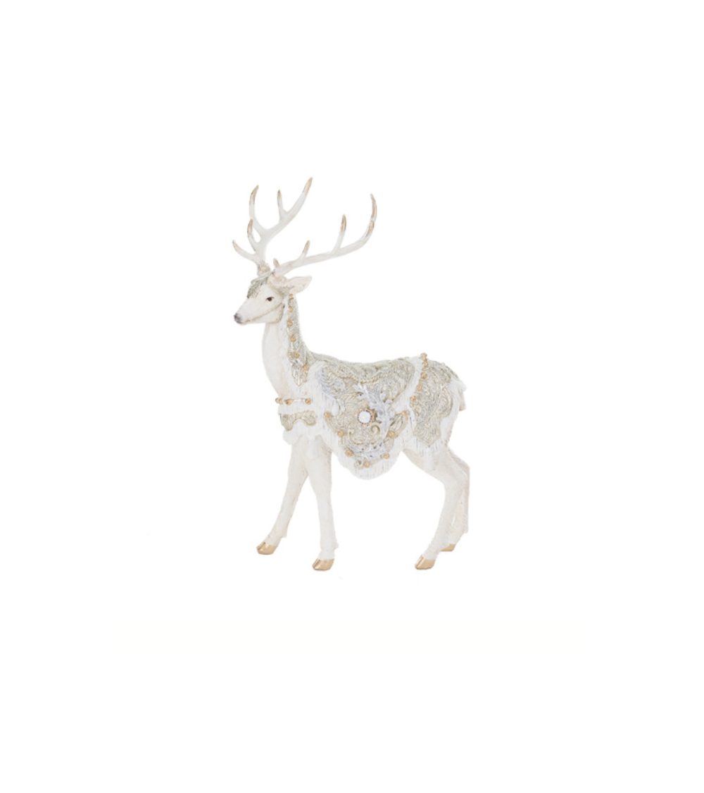La decorazione "Regal Deer with Saddle di Goodwill" è una figura scenografica ispirata a un cervo da parata, completa di corna dorate, zampe modellate e sella decorativa. Disponibile in diverse altezze e finiture crema, champagne e oro, è pensata esclusivamente come ornamento natalizio o da vetrina, combinando eleganza, lucentezza e un effetto scenografico sofisticato che la distingue dai comuni oggetti decorativi.