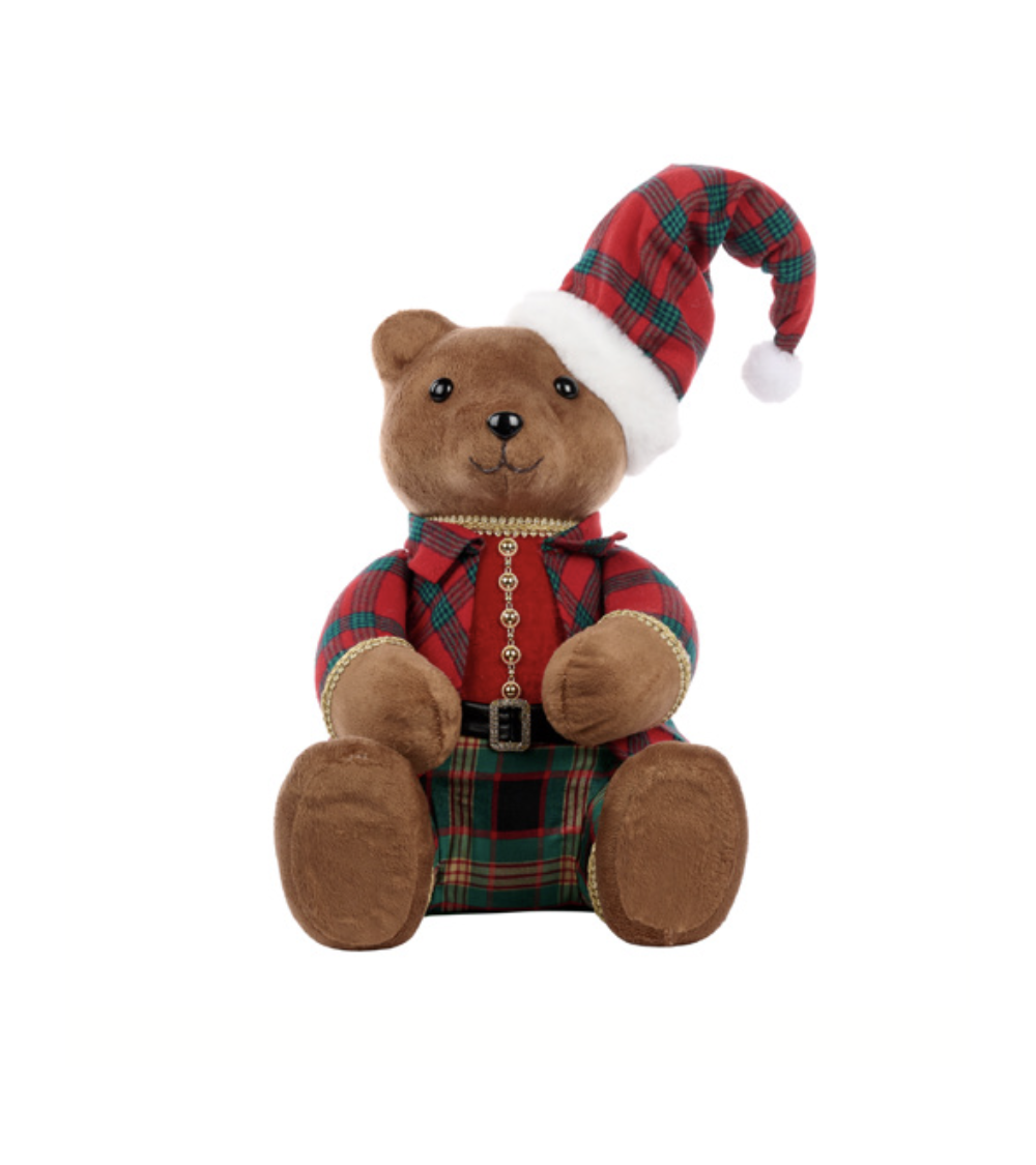 Una dolce figura di orso seduto, avvolto in un tessuto tartan rosso‑verde‑marrone e alto circa 37 cm, pensata per impreziosire ambienti natalizi con un tocco tradizionale ma raffinato. Il rivestimento in tartan suggerisce una storia d’altri tempi, mentre la posa “seduta” lo rende adatto per mensole o camini, integrandosi con elementi boschivi o chic‑rustici.