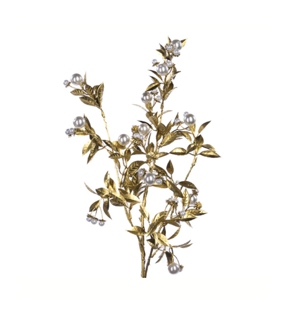 Un ramo decorativo dal profilo slanciato che miscela foglie metallizzate dorate e perle lucenti in un unico stelo. Progettato per essere inserito in un vaso o composizione da tavolo, dona verticalità e un richiamo elegante al tema natalizio: la finitura oro‑metallico accende lo sguardo, mentre le perle modulano la luminosità con delicatezza. Ideale come elemento di riflesso in ambienti raffinati, si distingue per le texture miste e la presenza scenografica senza dominare l’intero allestimento.