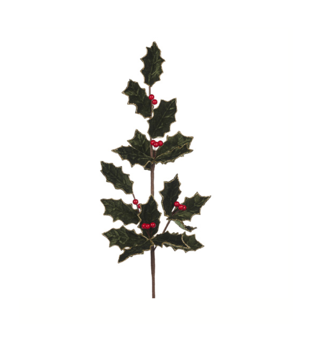 Un ramo alto circa 78,5 cm caratterizzato da foglie d’agrifoglio in tessuto e bacche decorative, progettato per inserirsi in composizioni natalizie come elemento verticale elegante. La finitura tessile delle foglie crea una texture morbida rispetto ai classici rami rigidi, mentre la presenza delle bacche aggiunge un punto focale di colore. Ideale come elemento d’accento in un vaso, accanto al camino o come parte di un display stagionale, questo stem unisce altezza, texture e stile sobrio‑festivo in un unico componente decorativo distintivo.