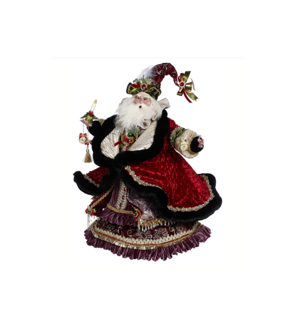 "Night by Xmas Santa” di Mark Roberts, alto circa 60 cm, è una scultura natalizia in edizione limitata, concepita per evocare la magia della vigilia: il tradizionale Babbo Natale veste tonalità profonde – blu notte, nero vellutato o borgogna scuro – ed è impreziosito da finiture oro, stelle applicate e riflessi metallici che brillano come un cielo stellato. La postura elegante, il viso sereno e i dettagli curati (passamanerie, gemme decorative, mantello drappeggiato) conferiscono all’oggetto un’eleganza senza tempo, perfetta per trasformare un angolo della casa in un piccolo teatro festivo. Questo Santa non è semplice decorazione: è un pezzo‑focale, pensato per chi desidera un Natale che unisca raffinatezza, atmosfera notturna e presenza scenica.