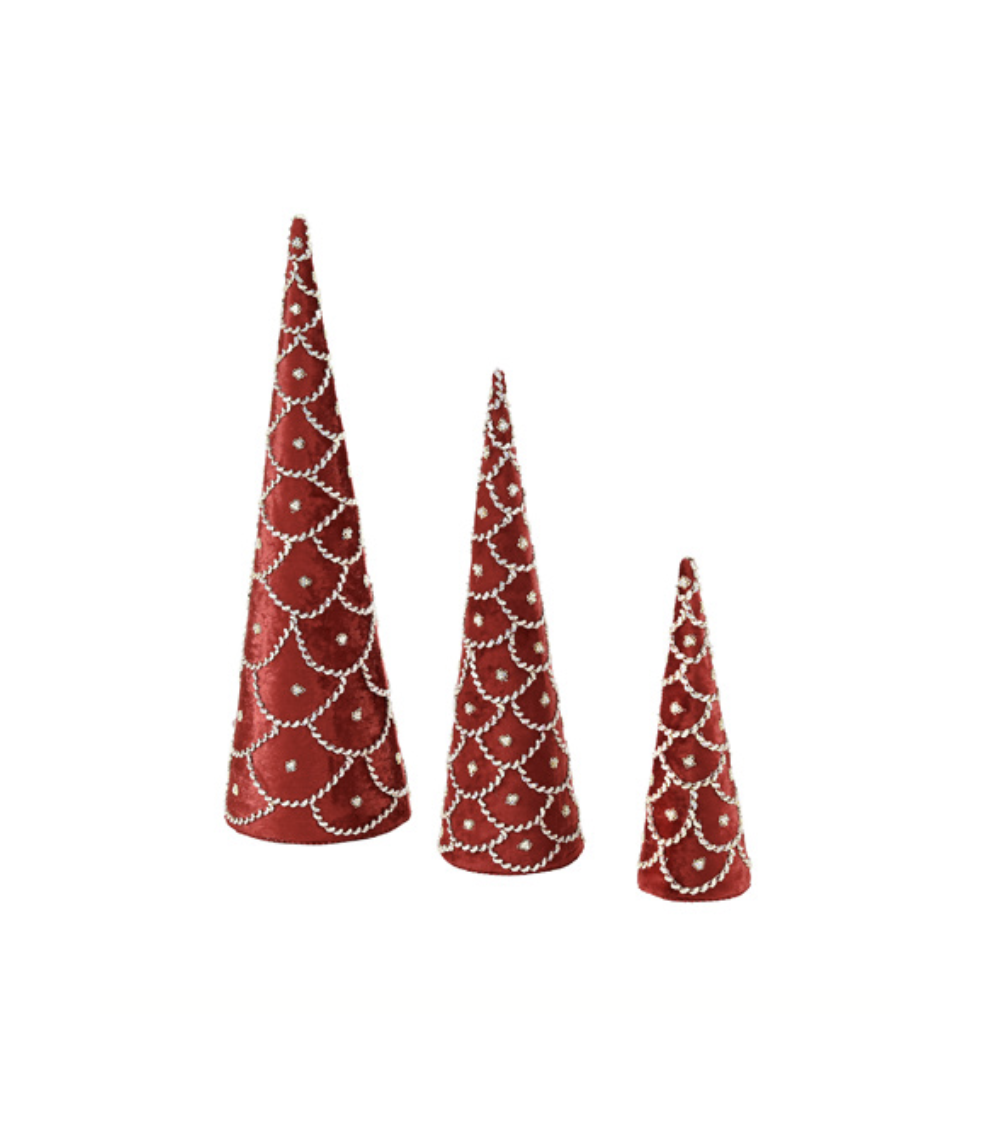Elegante set di tre coni decorativi natalizi, realizzati con rivestimento in velluto rosso e ricche rifiniture oro impreziosite da dettagli gioiello. Il design “scallop” presenta eleganti motivi ondulati che donano profondità e luminosità alla superficie, rendendo i coni veri e propri elementi d’arredo di lusso. Appartenente alle collezioni natalizie di Goodwill, celebre per lo stile raffinato e artigianale, questo set è ideale per decorare tavoli, camini o ingressi con un tocco sofisticato e festivo, perfetto per ambienti che combinano tradizione e glamour.
