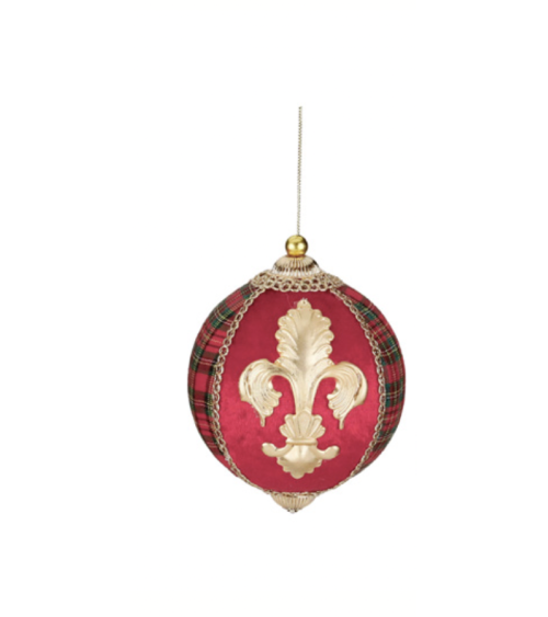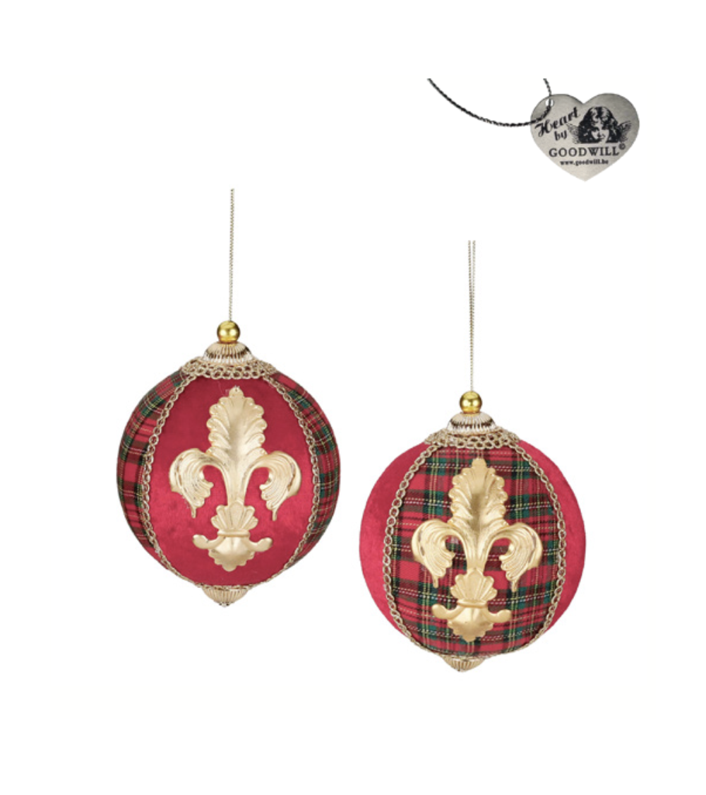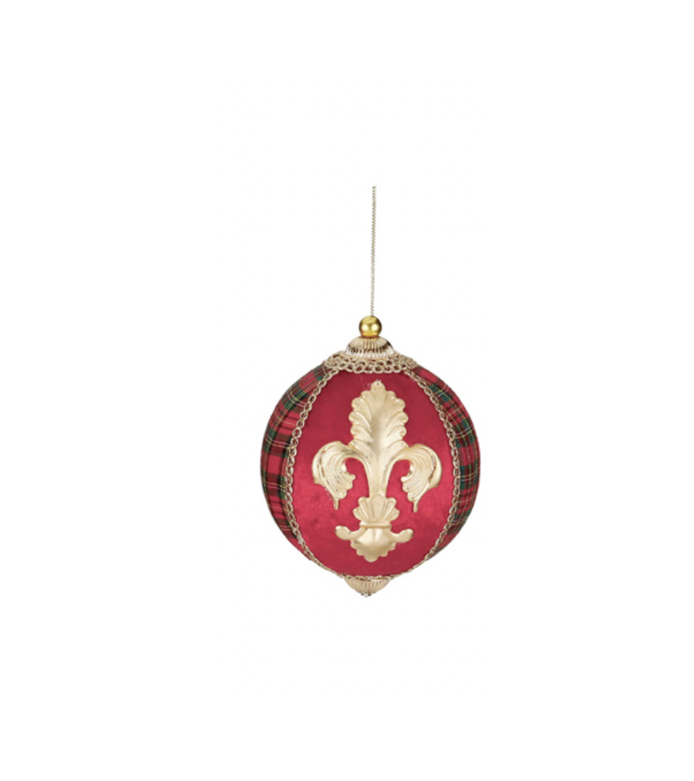 Eleganti sfere natalizie dal diametro di 12 cm ciascuna, caratterizzate da un rivestimento in velluto con motivo tartan nei toni del rosso e dell’oro, impreziosite dal motivo decorativo a fiore di lis che aggiunge un tono aristocratico / regale. La combinazione del tessuto velluto, del tartan classico e del dettaglio ornamentale rende queste decorazioni ideali per un albero o un ambiente natalizio elegante e dalla forte personalità.