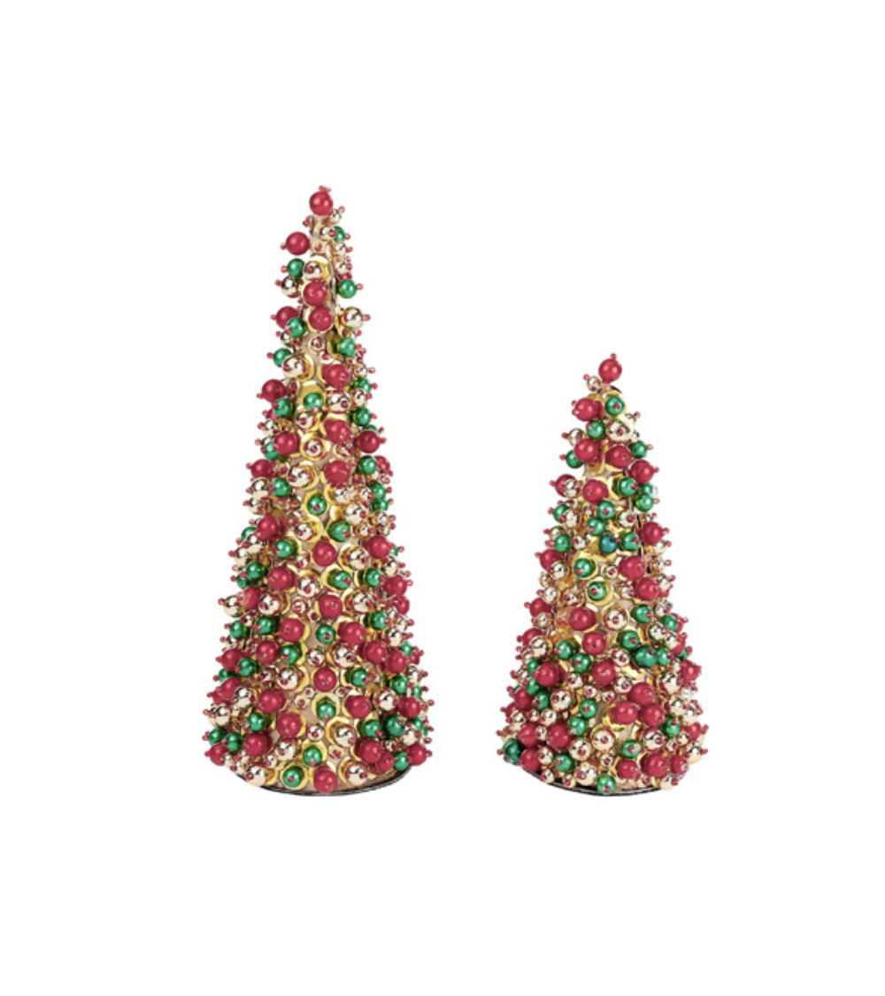 Raffinato duo di alberelli decorativi, alti 26 cm e 20cm circa , che uniscono il classico rosso e verde natalizio a dettagli dorati perlati. La finitura a perline conferisce luce e texture, trasformando piccoli oggetti in veri e propri accenti scenografici per mensole, tavoli o centrotavola, dove eleganza e spirito festivo si fondono con armonia.