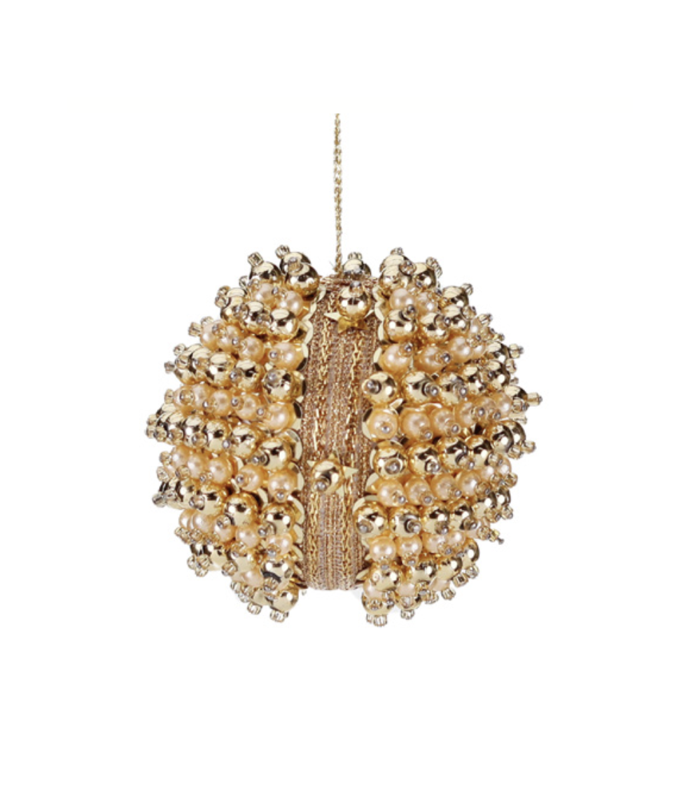 Raffinata pallina decorativa dorata, interamente rivestita da perline tridimensionali che catturano la luce e creano un effetto luminoso e sofisticato. Perfetta per arricchire alberi di Natale, ghirlande o composizioni festive, unisce eleganza e texture raffinata, diventando un piccolo ma prezioso accento di stile natalizio.