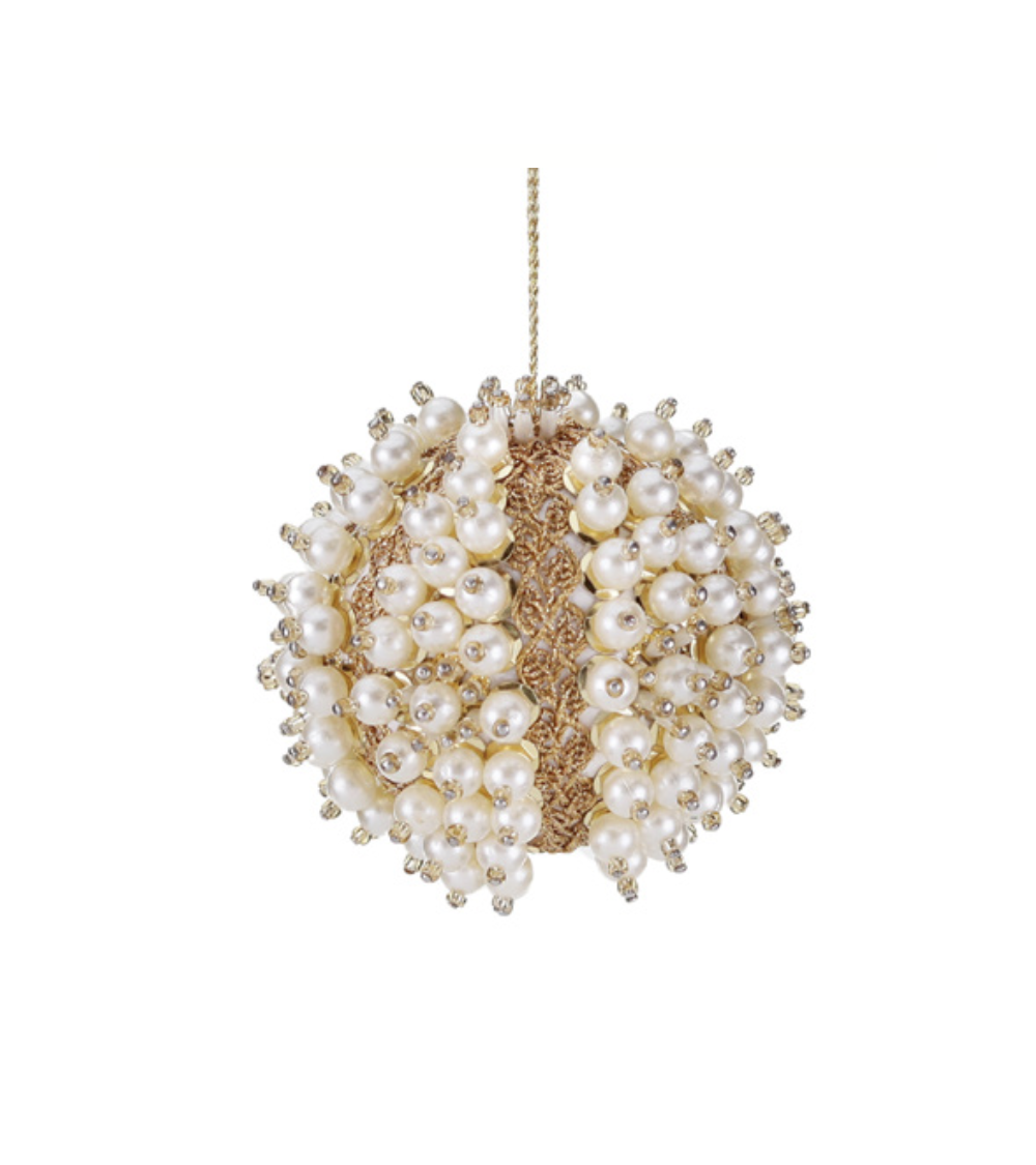 Raffinata pallina decorativa dorata e crema, interamente rivestita da perline tridimensionali che catturano la luce e creano un effetto luminoso e sofisticato. Perfetta per arricchire alberi di Natale, ghirlande o composizioni festive, unisce eleganza e texture raffinata, diventando un piccolo ma prezioso accento di stile natalizio.